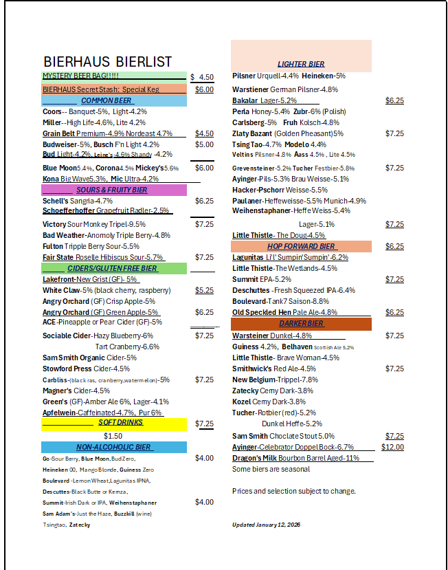 Randy “Bull” Kabes, a seasoned professional in the bar and food service industry, has launched “Bull’s Bierhaus,” a cozy, “old European” inspired establishment that harkens back to classic basement bars. With over thirty years of experience, Bull’s jovial nature and genuine kindness infuse the Bierhaus with a warm, welcoming atmosphere, making it a beloved spot for great drinks and camaraderie.